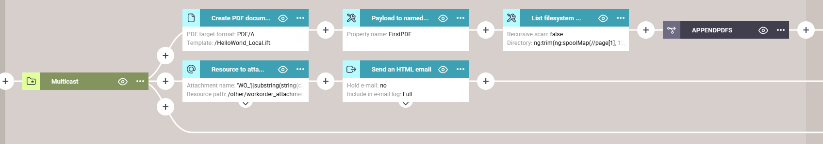 2. The top branch of the multicast ends with a call to the sub-workflow, AppendPDFs:
