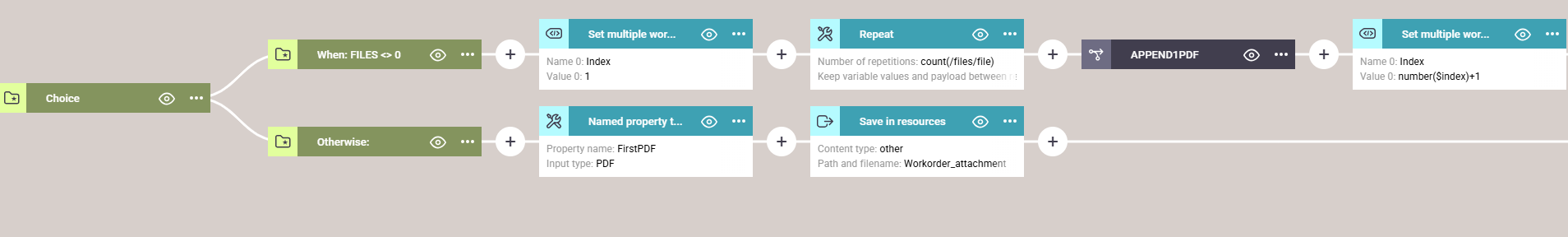 This sub-workflow first use the choice element to verify if there are any PDF files to append at all. The payload at this point is an XML, that contains all PDF files to append.