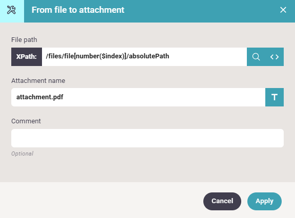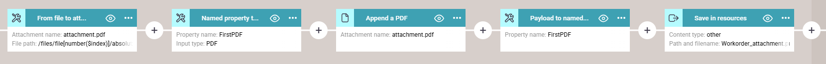First the workflow loads the current PDF file to append into an attachment with the command, From file to attachment: