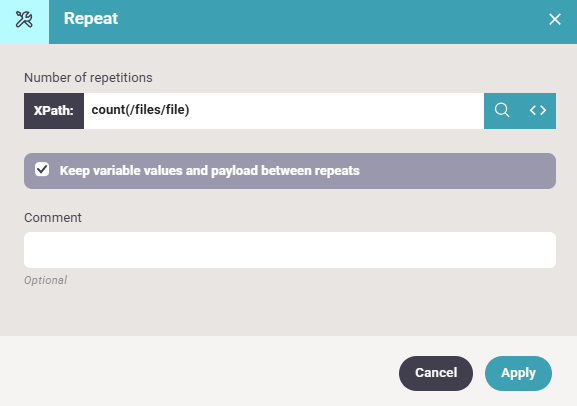 count(/files/file) calculates the number of files, that are found and we need to keep the value of the Index variable to increase it for each iteration - hence the activation of 'Keep variable values and payload between repeats'.