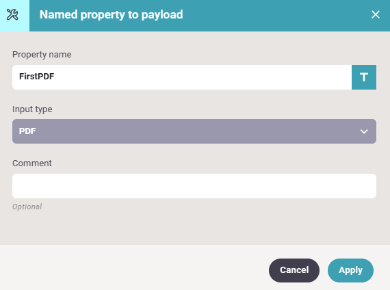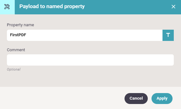 Now the sub workflow restores the PDF file, that we want to append this PDF file to, that is done with the component, Named property to payload: