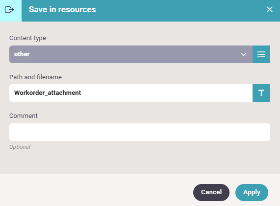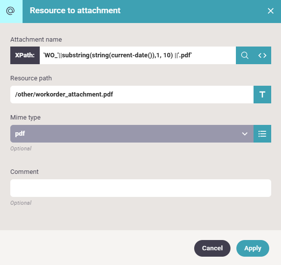 In the second branch of the main workflow the PDF has been prepared (this is covered in the sub-workflows below) and now we can setup the attachment with Resource to attachment: