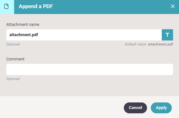As "Attachment name" specify the name of the attachment that should be appended to the payload PDF. If this is left blank, then the first available attachment is used (so it can be left blank, if you have only created one attachment).