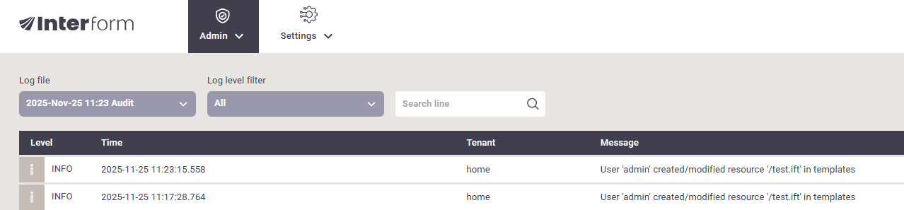 C:\ProgramData\InterFormNG2\profiles\default\logsHere the audit file is stored as interformng2_audit.log.
