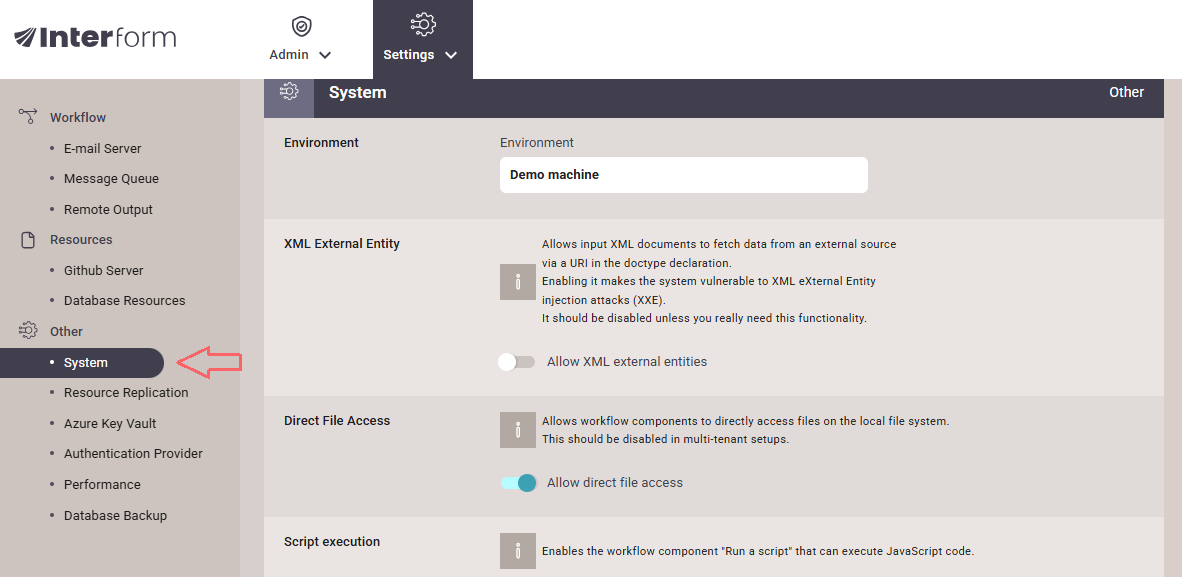 7. Inside InterformNG2 on the Windows/Linux machine we also need to sign on to the remote IBM i machine. You first need to sign on as a system admin e.g. the user ID "admin". Now select 'System' under the system settings: