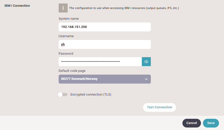 Here you can choose to use an encrypted connection, if you activate the Encrypted connection (TLS) option. If you activate this option a certificate is required. Normal support only includes the support of certificates, that are known by the used Java distribution on the client side and trusted on the host side (IBM i). On the host (IBM i) side you need to install the certificate and assign the certificate to the used applications similar to this: https://interform400.com/manuals/en/if400/ssl-connection-for-the-designe.html.
