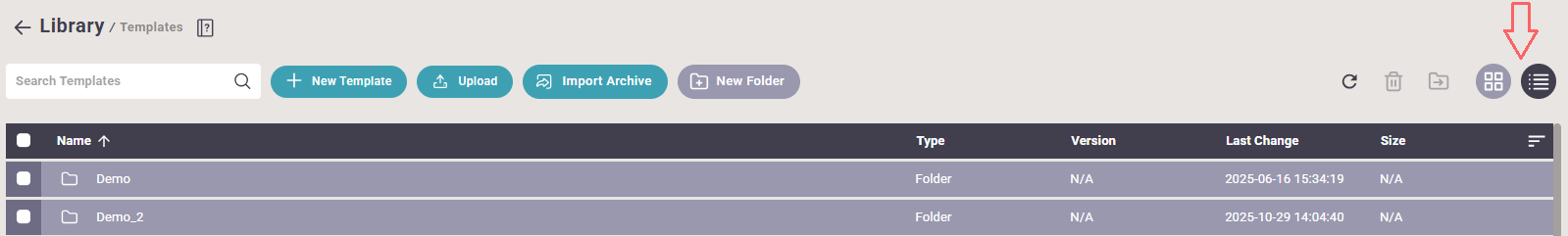 Inside the view you can decide, if you want to view the list of templates as a simple detail list or as thumbnails with these icons on the upper right:
