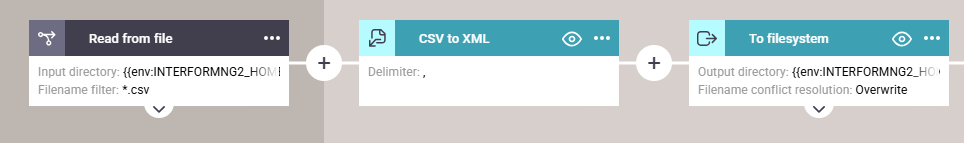 This converts the CSV file into an XML file with the CSV to XML workflow component. We save it as a file with the To filesystem component.