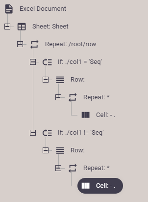 In the above setup we have inserted two conditions with the if element to determine if the current row is a header or not (i.e. does the first cell contain the text 'Seq' or not).