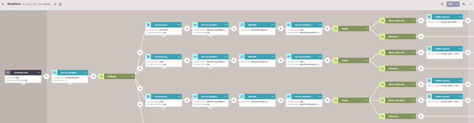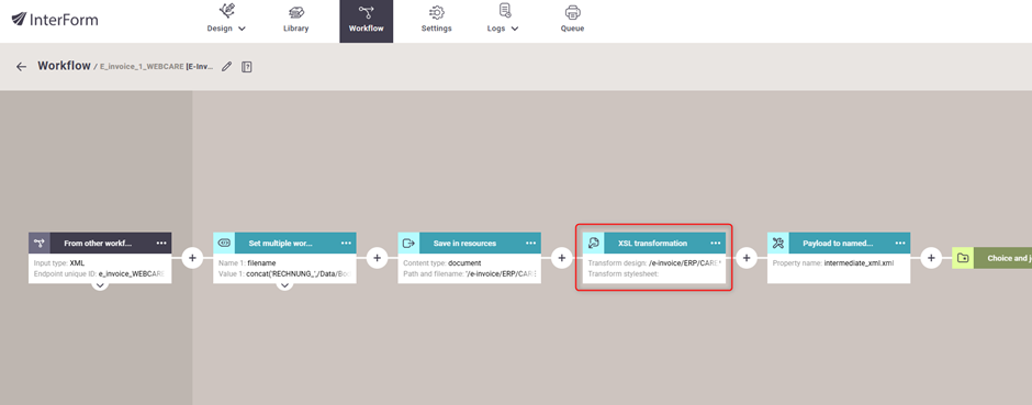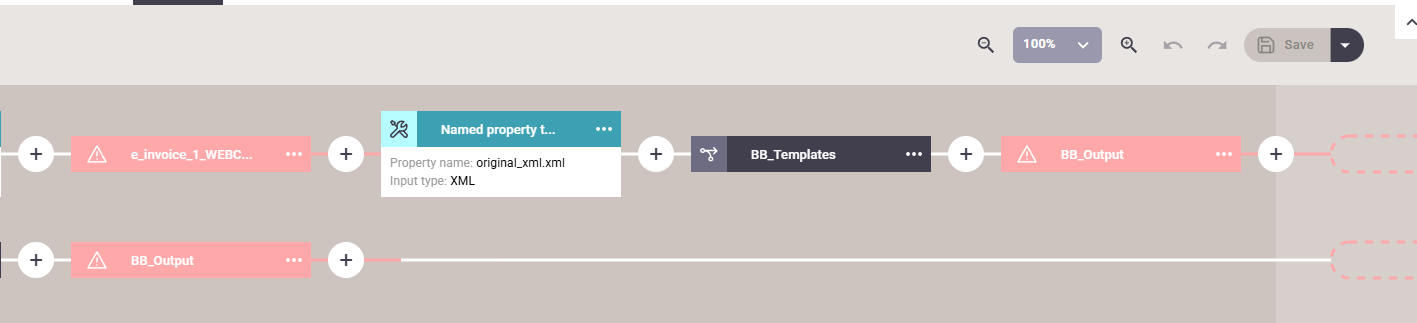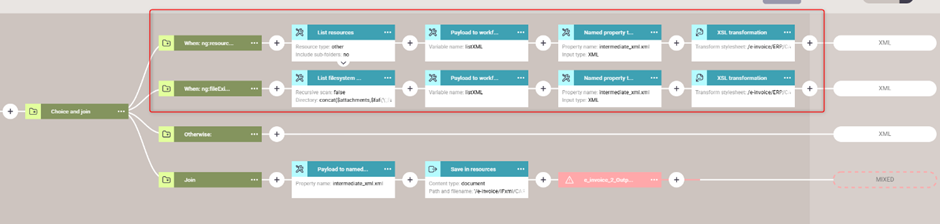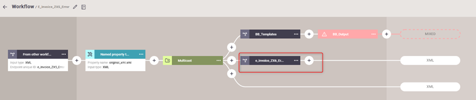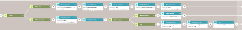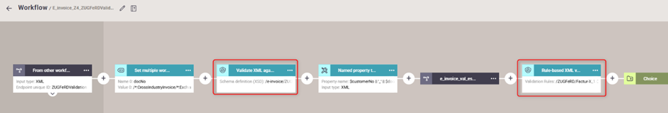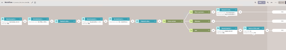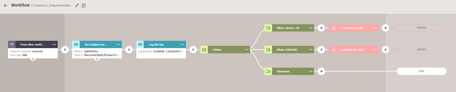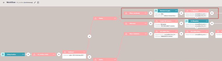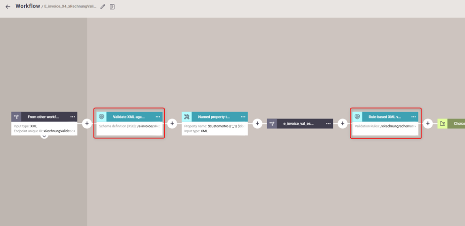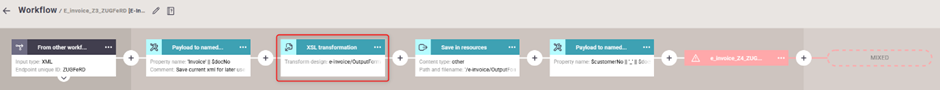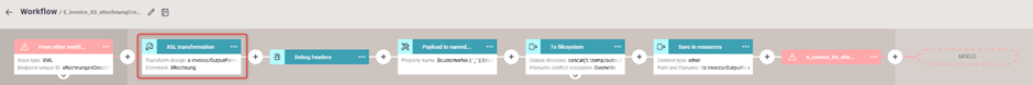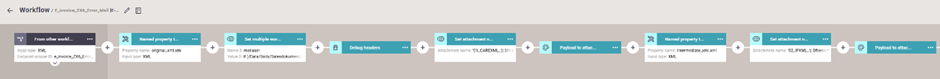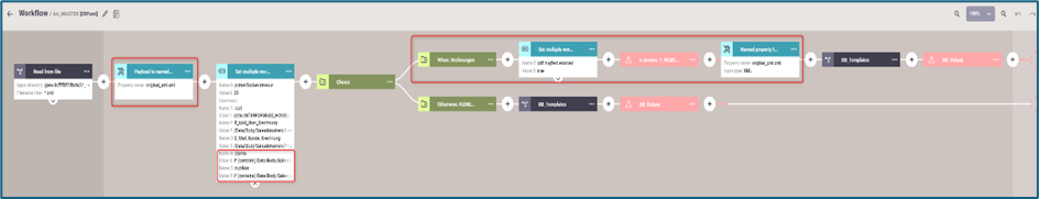 Nach der Verarbeitung und Validierung der E-Rechnung wird die ursprüngliche Input-care-XML erneut als Payload definiert, um anschließend den regulären Ausgabeprozess fortzuführen. Hierzu werden die Sub-Workflows BB_Templates und BB_Output aufgerufen.