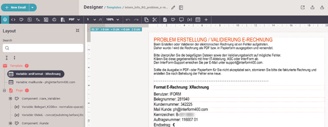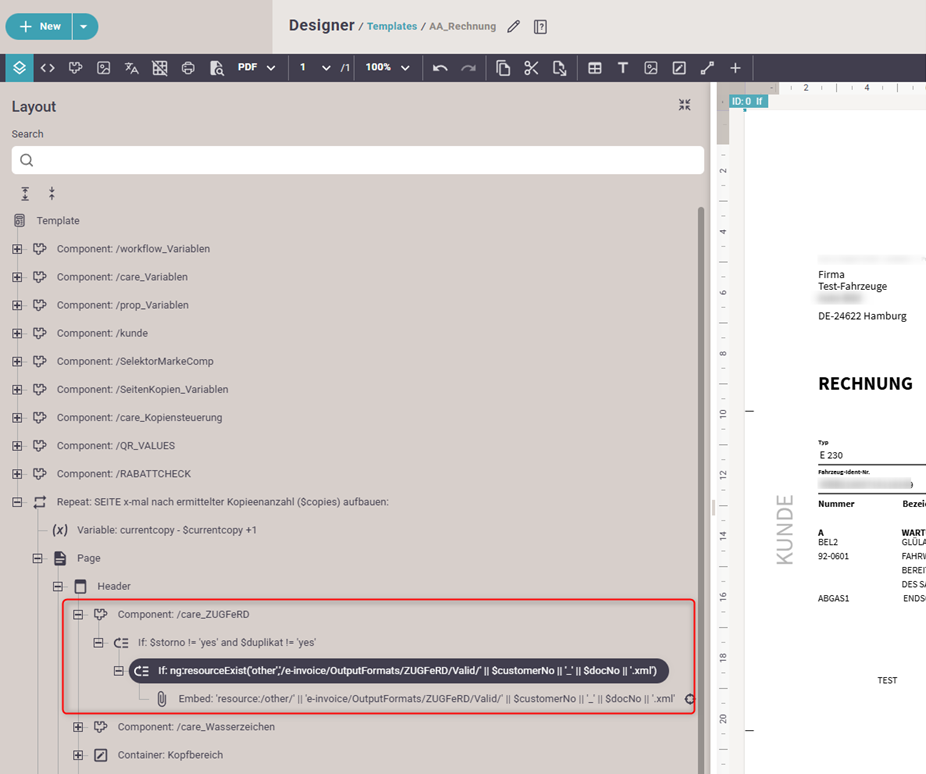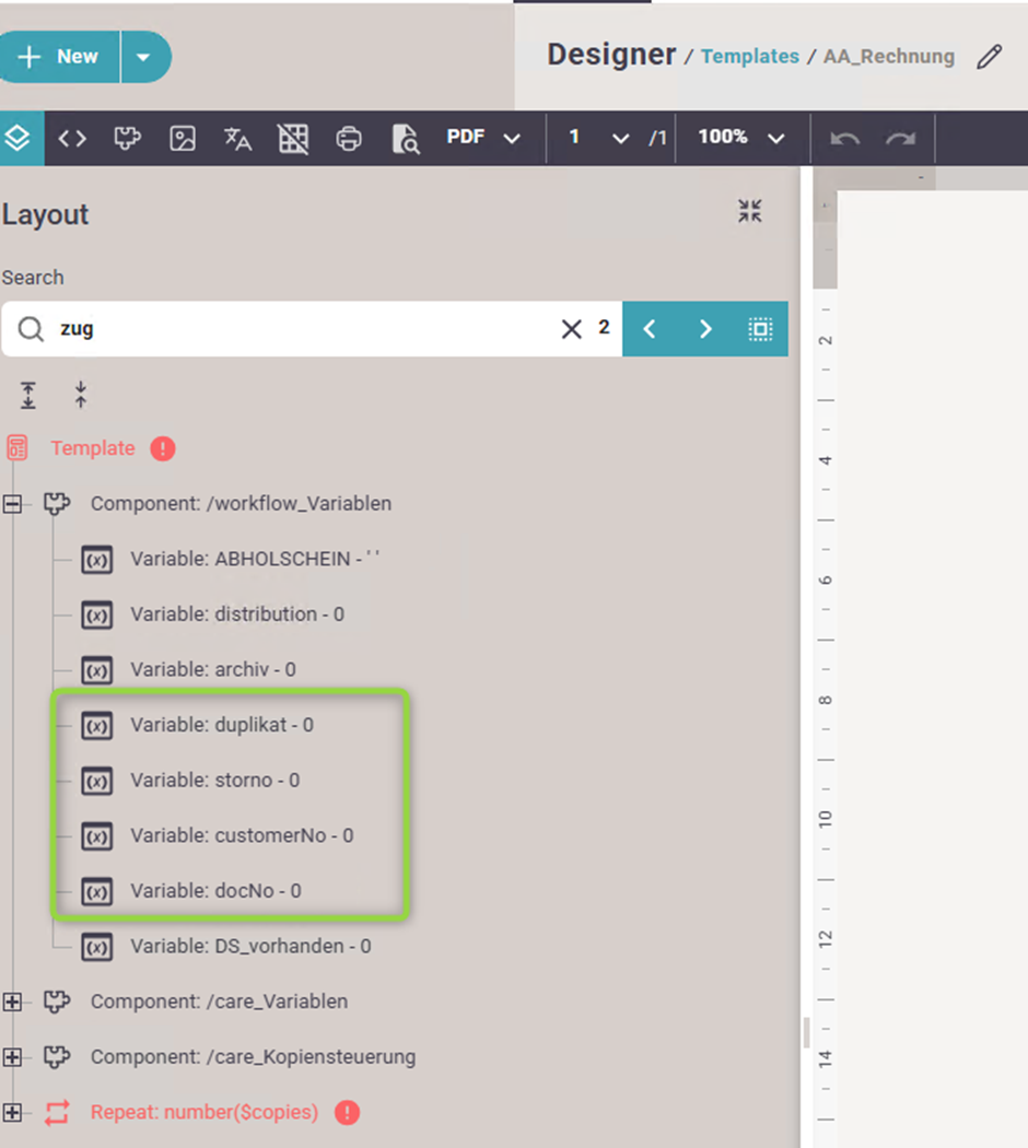Template Components | Workflow_Variablen | Die Variablen customerNo und docNo müssen vorhanden sein (z. B. bei Kostenvoranschlägen), da sonst die Einbettung der ZUGFeRD-XML fehlschlägt. | |