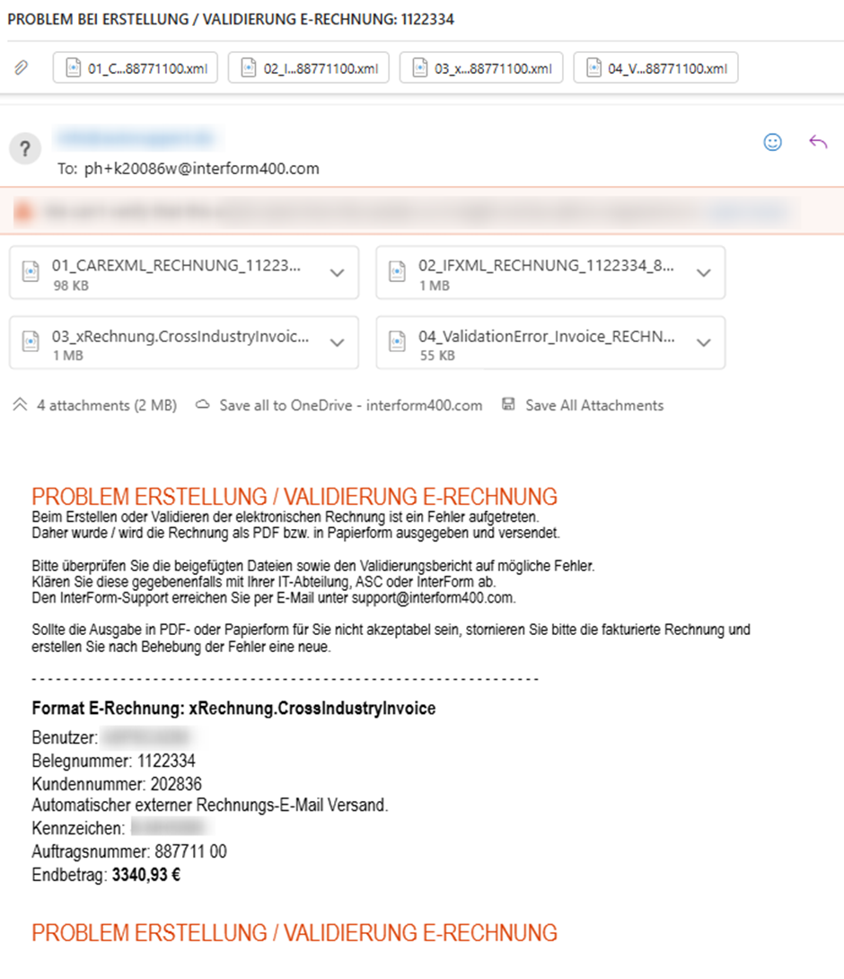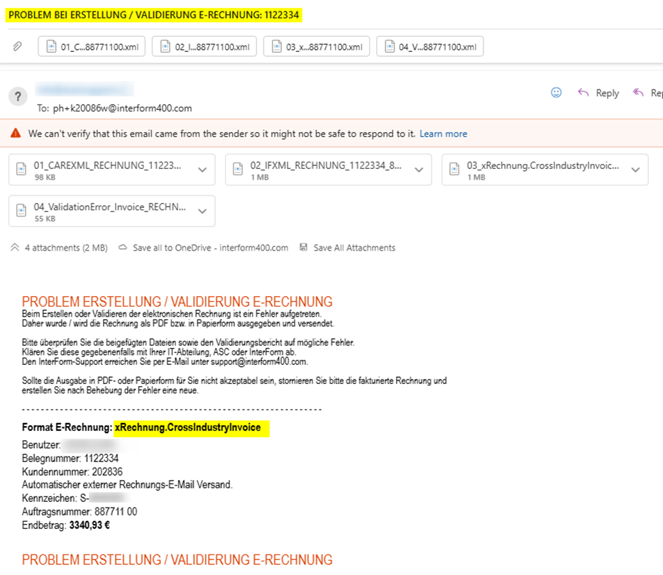 Ausgabe bei erfolgreicher Validierung der XRechnung - Eine XRechnung wird nur dann erzeugt und versendet, wenn im definierten Verzeichnis (resources) eine gültige XML-Datei vorhanden ist. Hinweis: Falls die Validierung der XRechnung fehlschlägt, wird automatisch der Standardprozess fortgeführt und eine reguläre PDF-Rechnung an den Kunden versendet. Der zuständige Benutzer wird zusätzlich intern per E-Mail über den Validierungsfehler informiert.