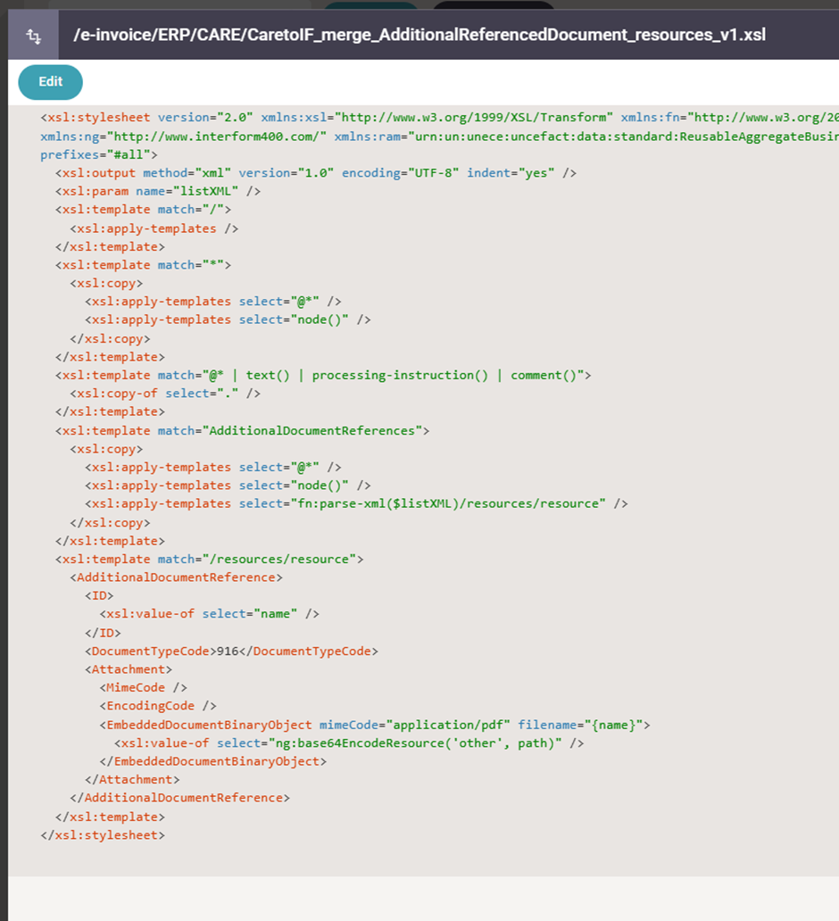 CaretoIF_merge_AdditionalReferencedDocument_resources_v1 und CaretoIF_merge_AdditionalReferencedDocument_v1 | Ergänzen weitere rechnungsbegründende Dateianhänge (PDF) als Base64-codierte Dateien in die E-Rechnung (im Zwischenformat). | ||