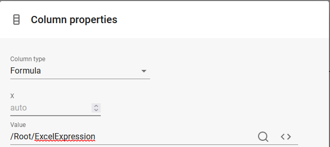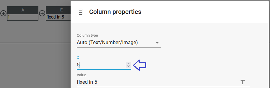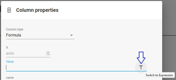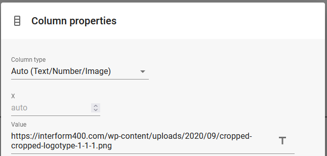 Here we focus on the data, that we put into this cell. That is setup on the field called Value. You can insert a fixed value by simply typing the text into this field while the field is in text mode. You can see the current mode on the right. The capital T means, that InterFormNG2 expects you to type in a text constant.