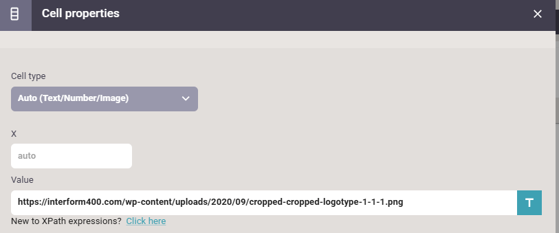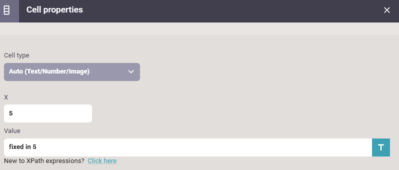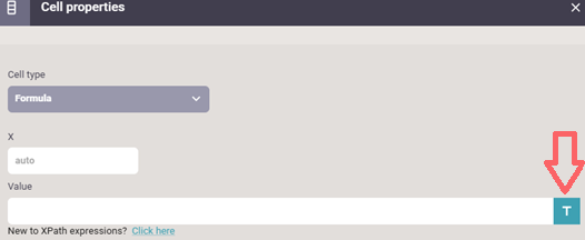 Here we focus on the data, that we put into this cell. That is setup on the field called Value. You can insert a fixed value by simply typing the text into this field while the field is in text mode. You can see the current mode on the right. The capital T means, that InterformNG2 expects you to type in a text constant.