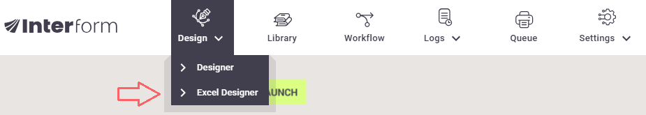 To access the Excel Designer, navigate to Design in the left panel and select Excel Designer from the dropdown, as shown in the image.