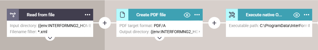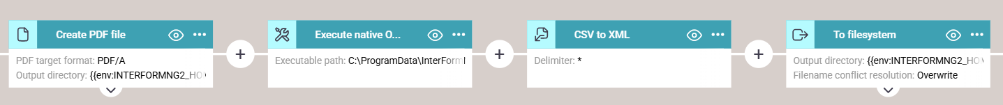 This workflow first creates a PDF file and then calls a bat file via the Excecute native O/S command component. This component overwrites the payload (the input file for the Create PDF file) with a CSV file. In the example above this CSV file is converted into an XML file and this XML file is written to an output file.
