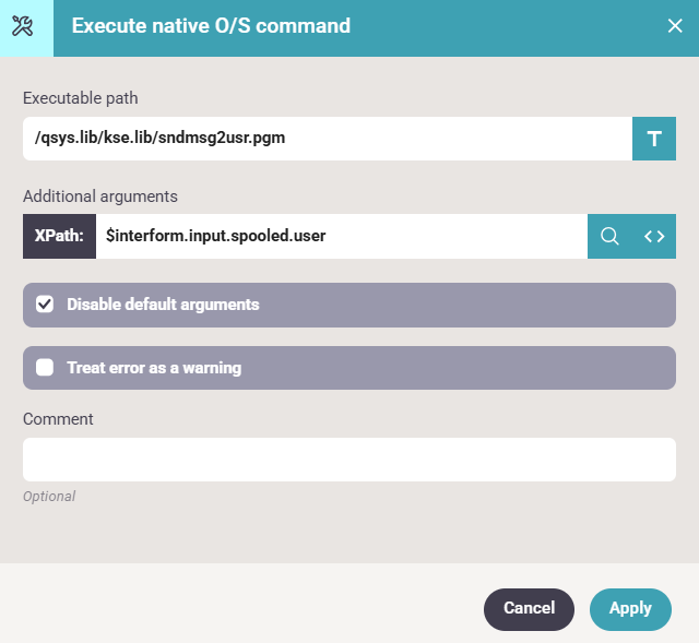 Here is an example of how a program can be called on the IBM i. In this example we have a workflow, that monitors an output queue, and we want to call a program on the IBM i to send a message to the user profile, that generated the spooled file.
