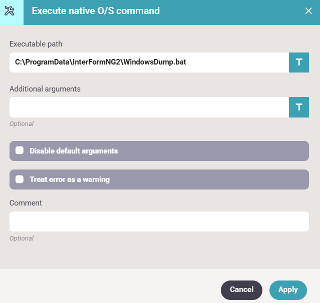 The Execute native OS command setup above looks like this: