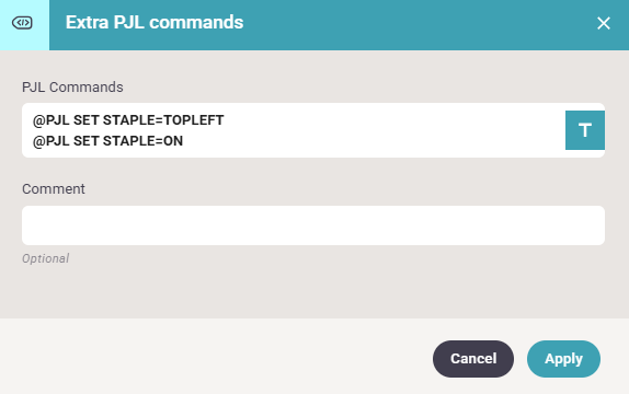 The PJL commands, that you want to insert in the PCL output print data stream. Remember, that this is not limited to a constant text, but it can be an XPath expression, which can also use workflow variables. The PJL commands should be written as shown above: Each PJL command must start with @PJL, and you can insert multiple PJL commands as shown above. Each PJL command must be divided with hex 0A (Line Feed) and you can insert this by simply pressing Enter between each command. The commands can of course also be stated as an XPath expression to make it more dynamic.