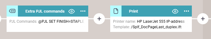 Here the Extra PJL command is executed prior to the print component, but it can also be followed by e.g Create PCL document if you want to keep the merged print data stream in the payload.
