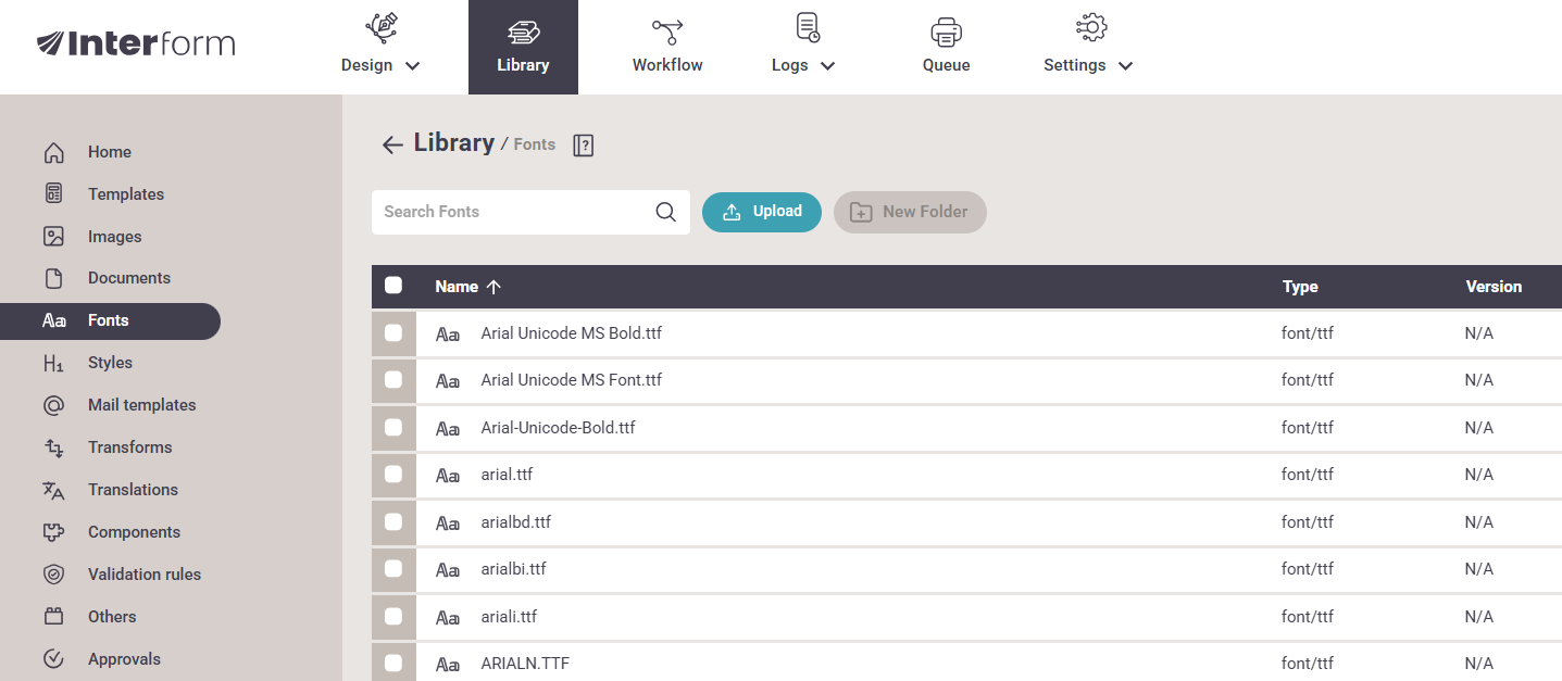 To install a ttf file you select the Library Tab in the top of InterformNG2 and then the Fonts folder either as a tile on the top right or the Fonts folder on the left.