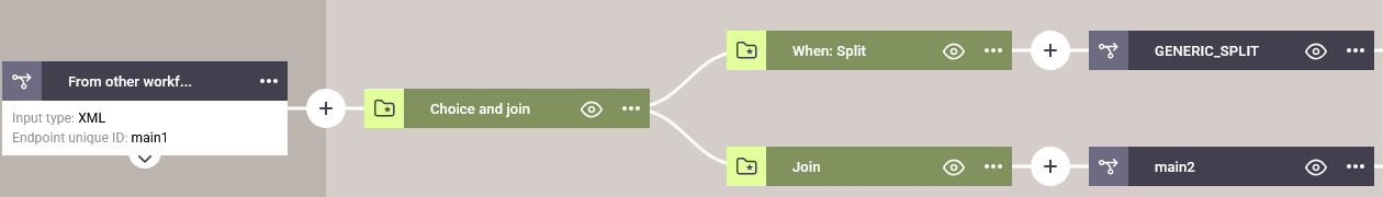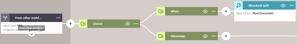 The example above can be used, if you are not splitting up too many input file types. If there are many, then you should consider to setup a generic way to select the two transformations via workflow variables before the generic_split workflow is called and then only have one branch for each variation of the path used for splitting up the XML file, as this path cannot be defined dynamically via an XPath expression.