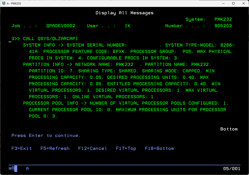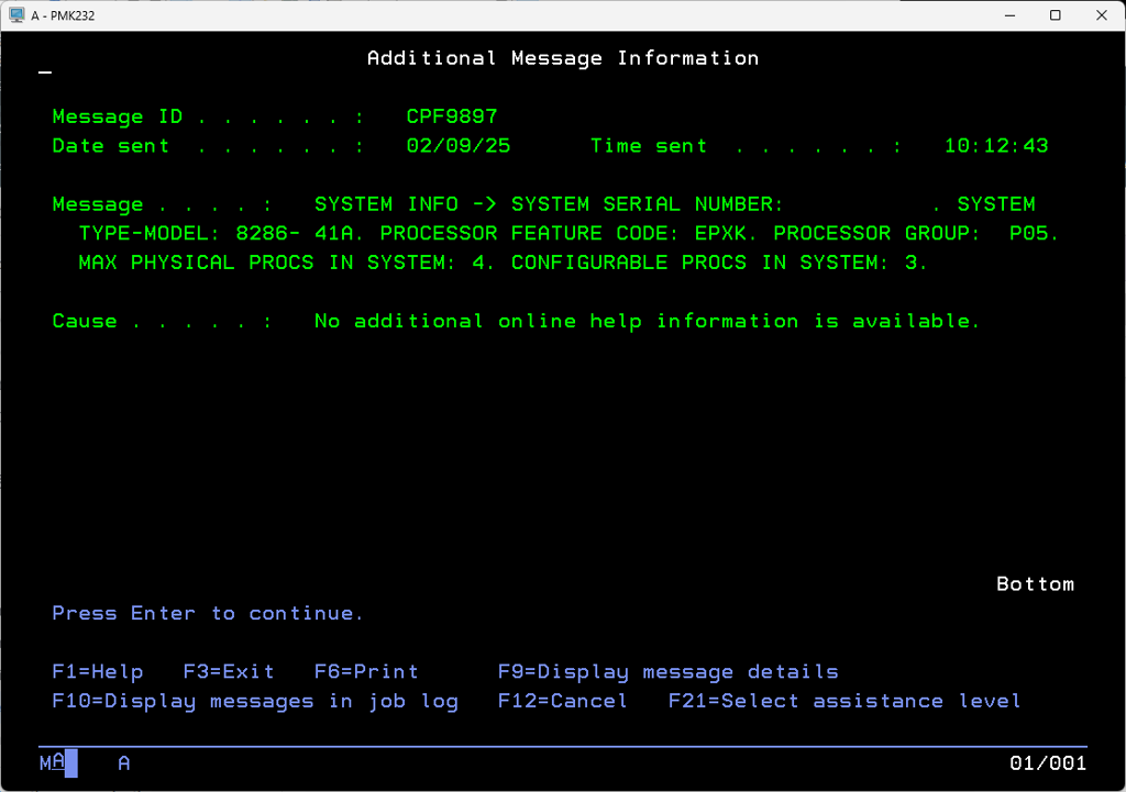 - Place cursor on resulting message “SYSTEM INFO ->…” and press F1 to see the message detail