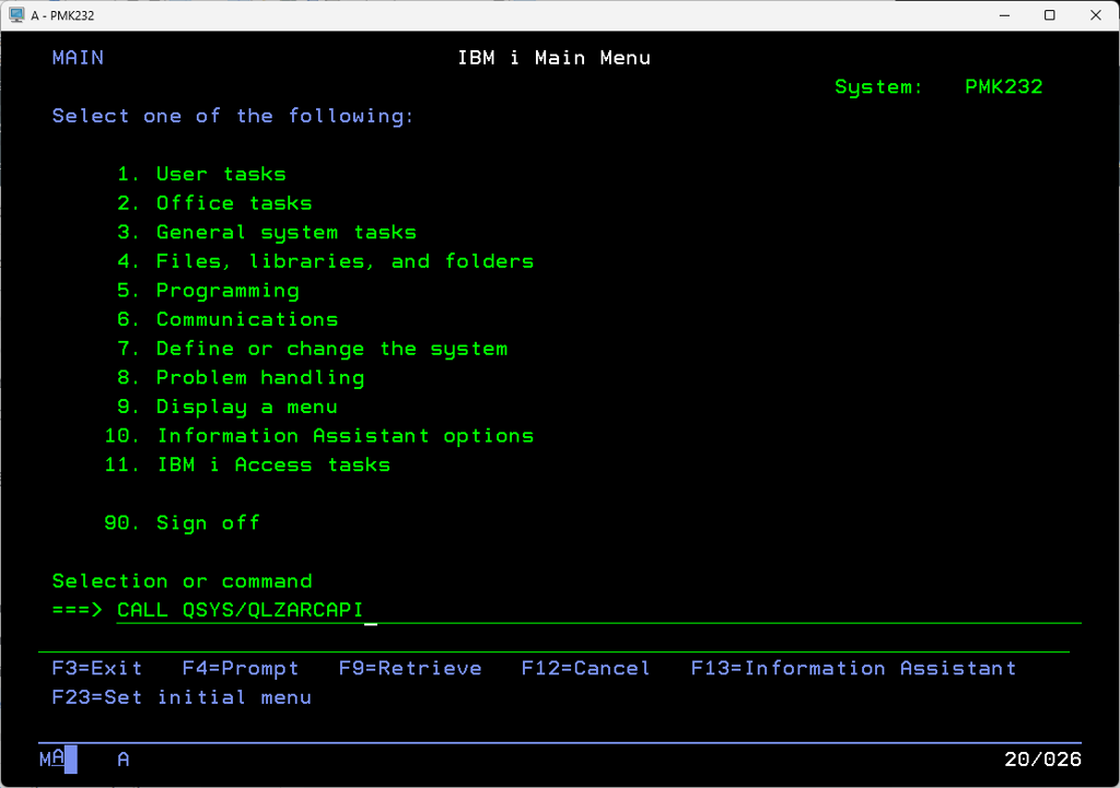 CALL QSYS/QLZARCAPI