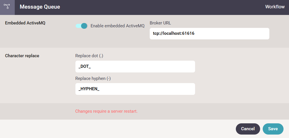 A workflow can be initiated by an MQ message. Create a new workflow and specify input type as either "From ActiveMQ" or "From IBM MQ" depending on what type of MQ that sends the message. When you select Active MQ as the input type on a workflow you ...