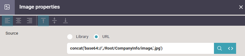 In the example above we define an image with the contents of a URL. The data for the barcode is found in the input XML file, that contains the base64 encoded image in the node /Root/CompanyInfo/Image: