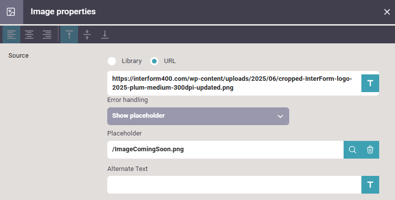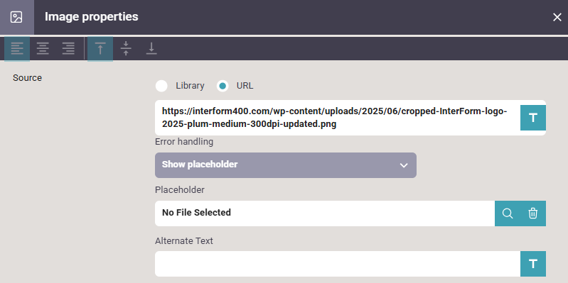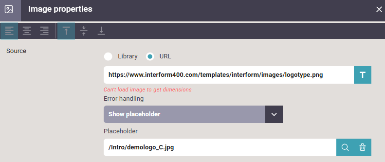 This placeholder image is then used in the designer only in order to replace the linked image in the URL. You can select the placeholder image from the Library via the magnifying glass on the right and remove the reference to a placeholder image, if you click the trashcan icon on the very right.