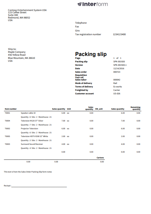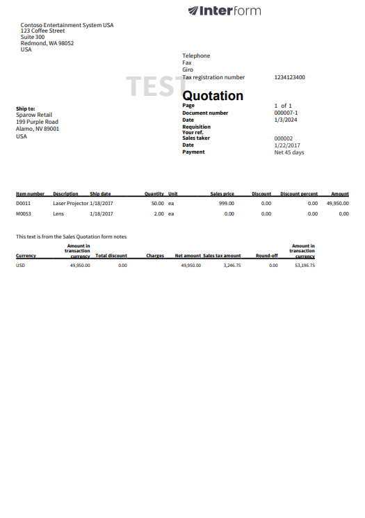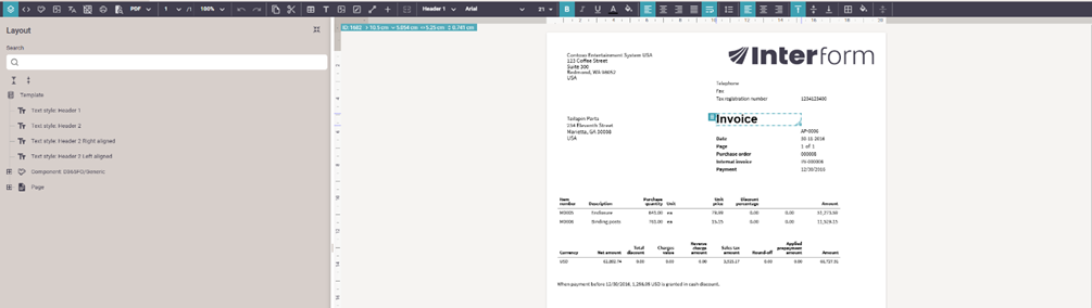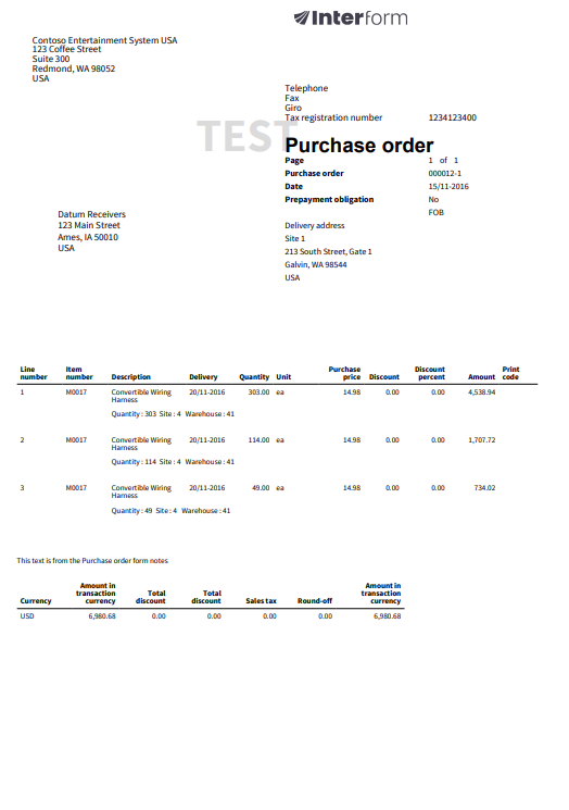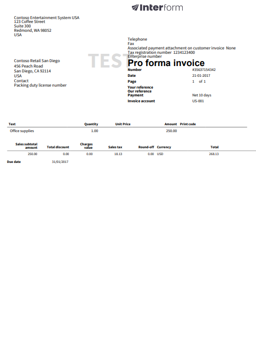 The InterForm Dynamics365FO package is a comprehensive plug & play solution for creation of business documents like, Invoices, Purchase orders, account statements etc.. The package comes with a standard design, which can be modified for corporate branding. Printing, e-mailing, archiving in Sharepoint is part of the standard delivery – ready to go when the configuration is done.