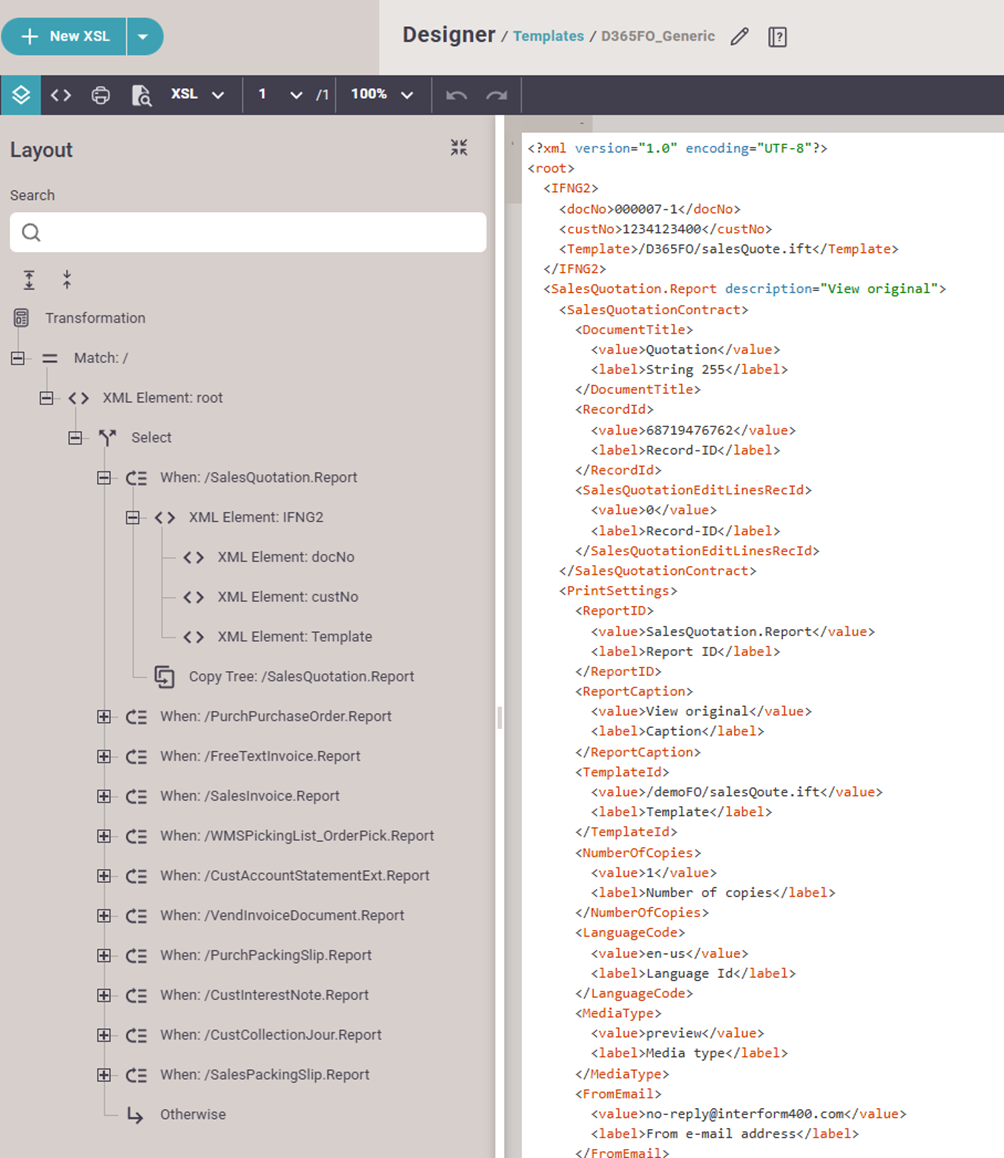 The Transformation below is used to identify the document number, customer number and template Id from the xml if the data is available otherwise the data is hardcoded in the xml structure specific for the template id. This transformation is made inside of InteformNG2 as an ixt file which can be used to enrich the xml with new data. The main purpose of this transformation is to introduce other nodes to the xml which we will be using in the Dynamics365FO package.