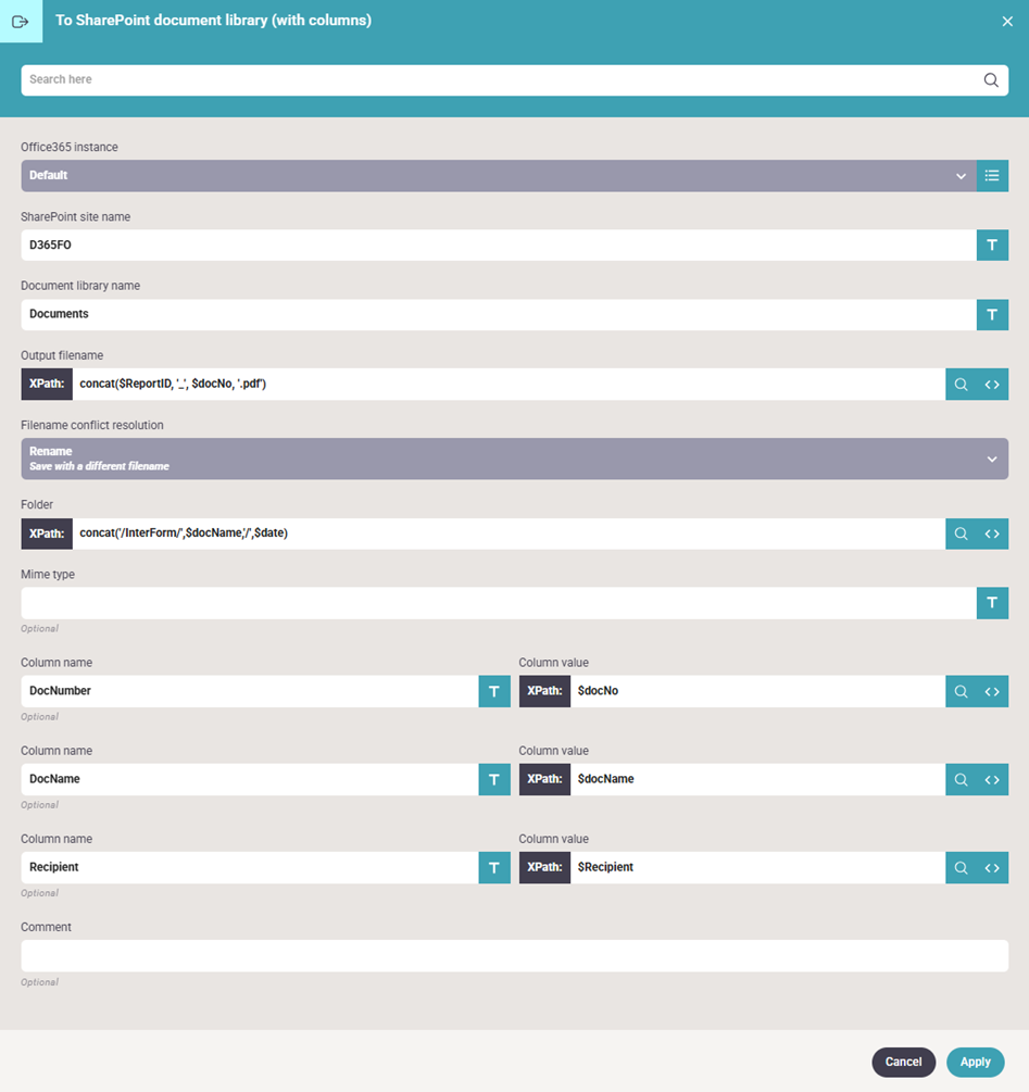 In InterFormNG2, we have a SharePoint component used to archive PDF documents on the SharePoint site.