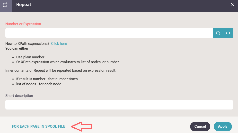 On the Repeat element select For each page in the spooled file on the bottom left: - and click Apply.