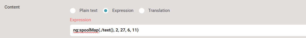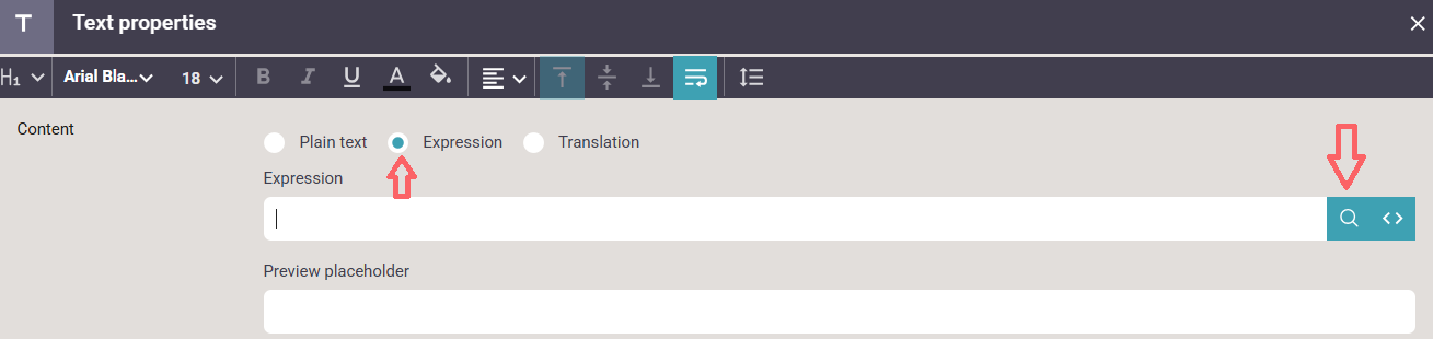 The final step is to map data from the current spooled file page. You do that with the text element inside the page, and here you need to click Expression in the top: