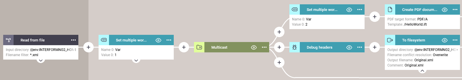 The multicast workflow component can be used, if you want to create multiple outputs from a single input file. You e.g. might want to create a PDF file, an email and a print output from a single input XML file.