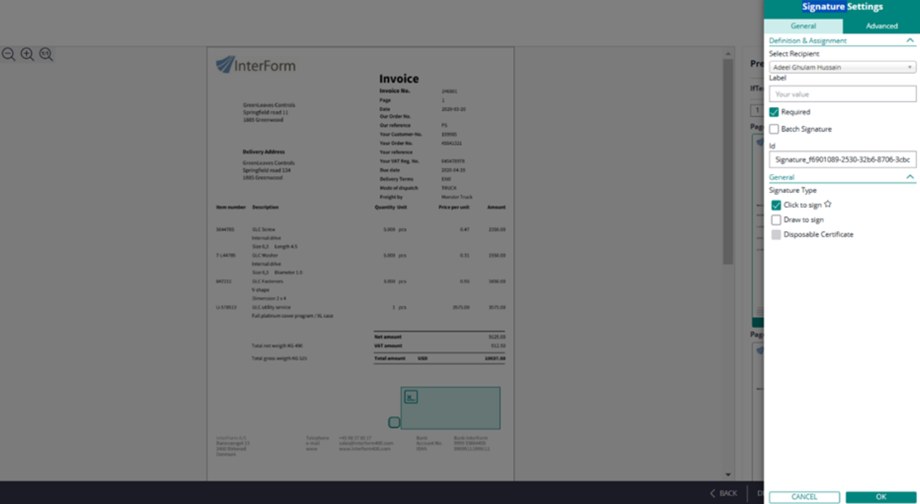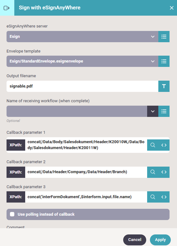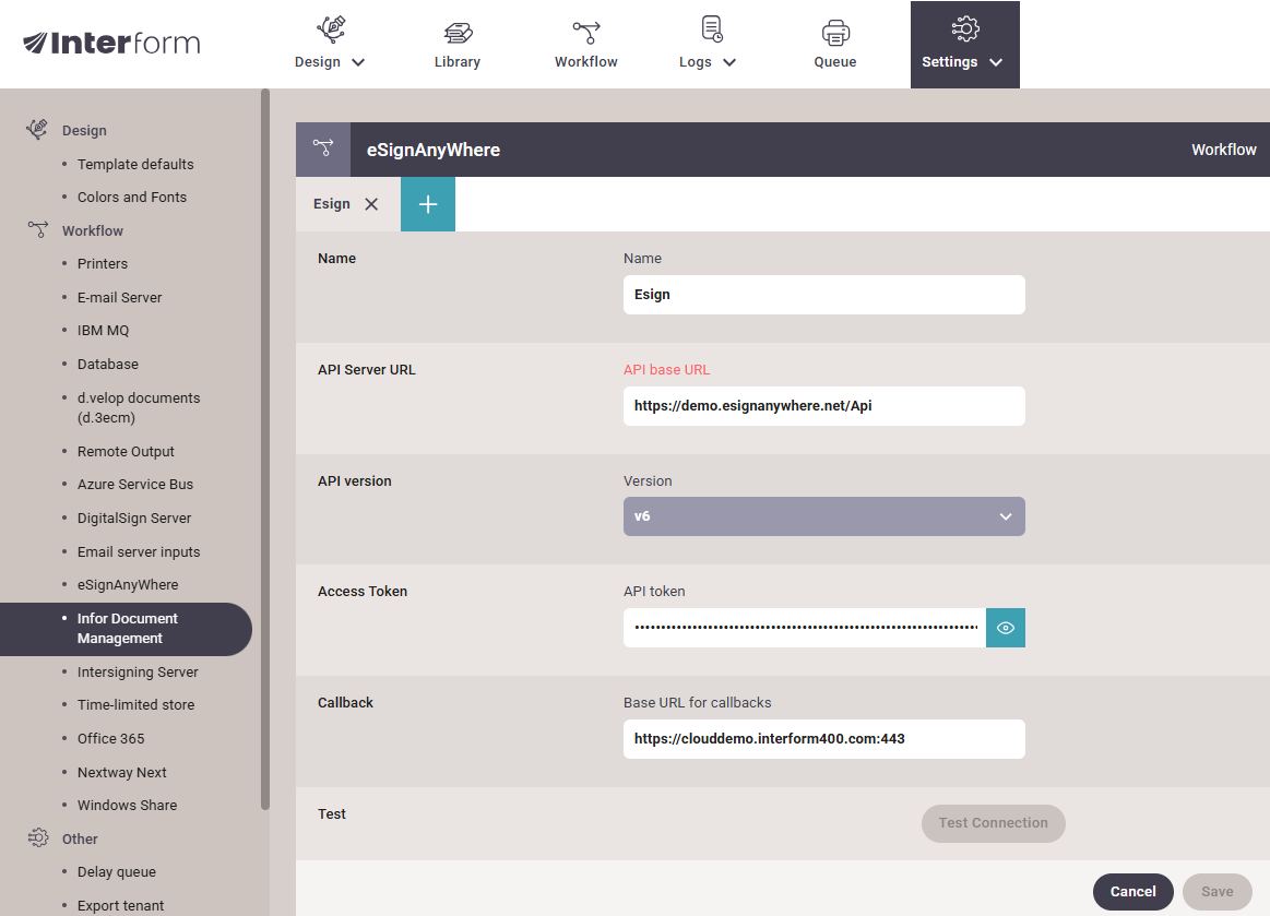 Callback: Base URL for callbacks is optional and only needed if you want to be able to create a workflow that is executed when the signing process is complete. In a simple network setup, the callback URL is simply the domain or IP of InterformNG2 including protocol, for instance https://18.100.45.32. However, note that if you are using the eSignAnyWhere cloud solution, then it only supports callbacks with HTTPS protocol and only on port 443. If you want the callback to go directly to InterformNG2, then InterformNG2 must be installed to use port 443 and use HTTPS protocol.