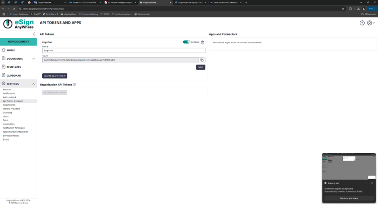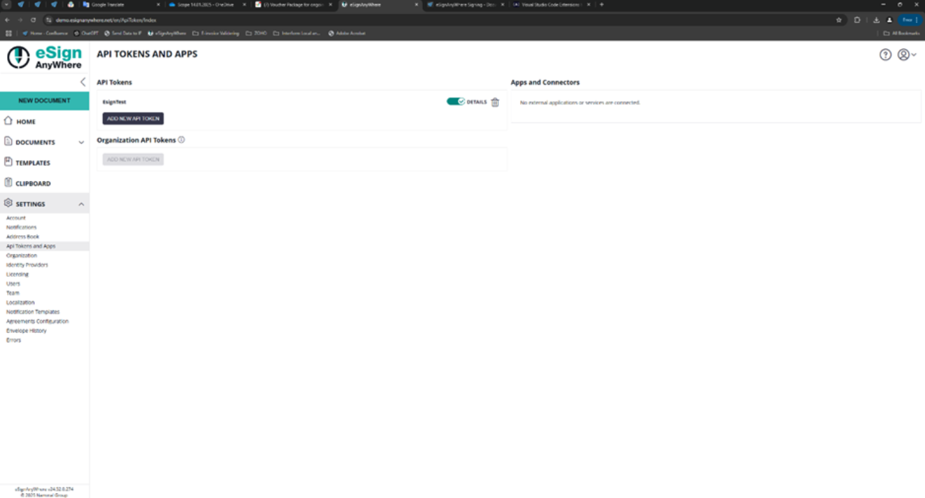 Access Token: For access token you need to create an API token in the settings on the eSignAnyWhere web site under “Api Tokens and Apps”. Copy-paste the generated token here.
