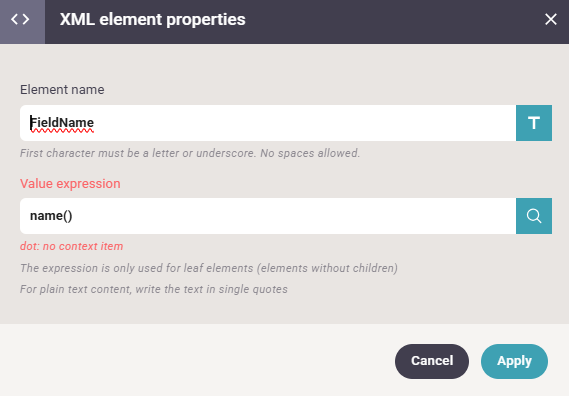 With the expression, name() we extract the name of the current node (found via the repeat) and put it into the FieldName node.