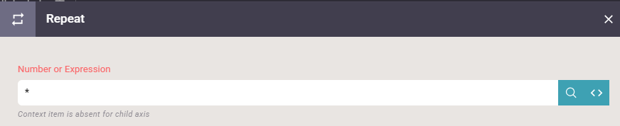 We simply use an asterix (*) to define a repeat for all fields/nodes found in the row no matter what the name of the field/node is. Please note, that we can ignore the error/warning as the designer tries to validate the expression based on the sample xml file which may have been selected - in this case no sample XML file has been loaded - hence this warning.