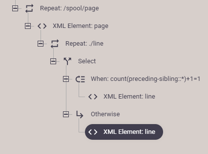 In the generic spooled file transformation we have a repeat loop for all the line nodes in the input spooled file and inside this repeat loop we need to identify the current line number and here select another value if one of the relevant line nodes has been found.