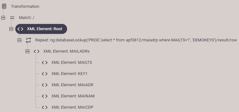 ng:databaseLookup('PROD','select * from apf3812/maiadrp where MAILTS=?', 'DEMOKEYS')/result/rowWith this expression the repeat iterates through each record, that has been extracted.