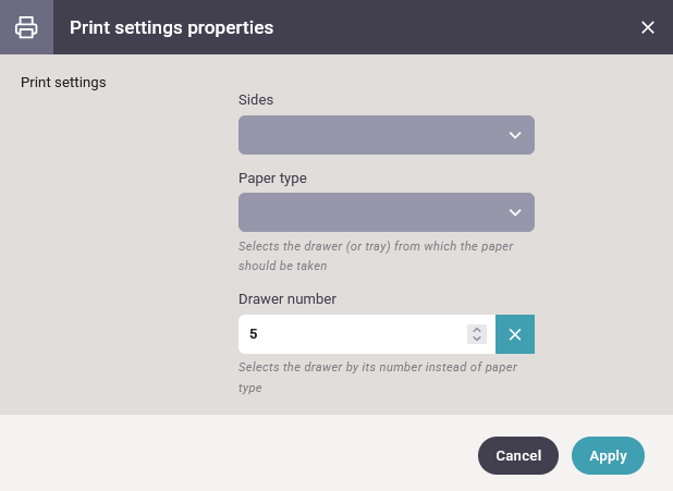 Instead of selecting the drawer indirectly via the paper type above you can also select the printer drawer/tray via the drawer number. You can type in a number or click the arrow keys on the right to increase/descrease the number. This number is not the physical drawer number, but the PCL drawer number. You might need to do some testing to identify which PCL drawer number you need to select in order to make the printer select a specific drawer. The drawer number stated here must be in the range 0 to 255.