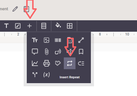 To insert a repeat element you click this element in the top of the designer: