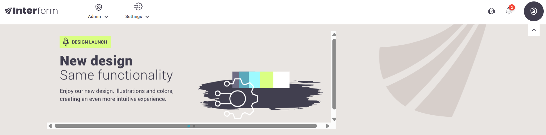After you have entered the current password and the new password you click the SET NEW PASSWORD icon to move onto the dashboard of InterformNG2. In the top you may notice, that the user perhaps does not have access to much:
