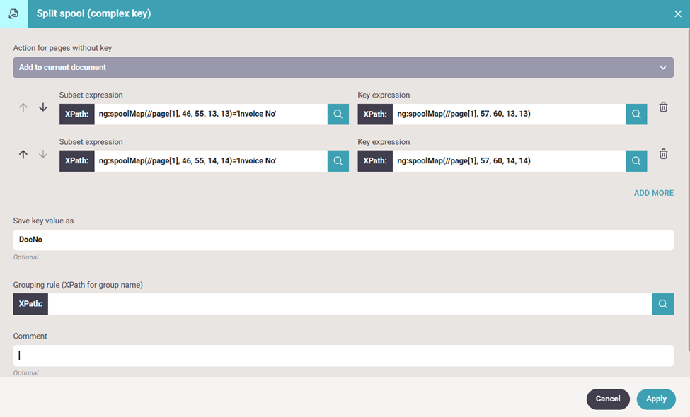 The field "Grouping rule (XPath for group name)" can be used to specify a rule for grouping pages. This can be used to group the split pages together in a smaller number of spooled files.