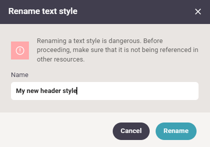 Watch out: If you rename a style and have any text elements in your templates, that are referring to this style, then these template can no longer be used as they refer to a style, that no longer exist..