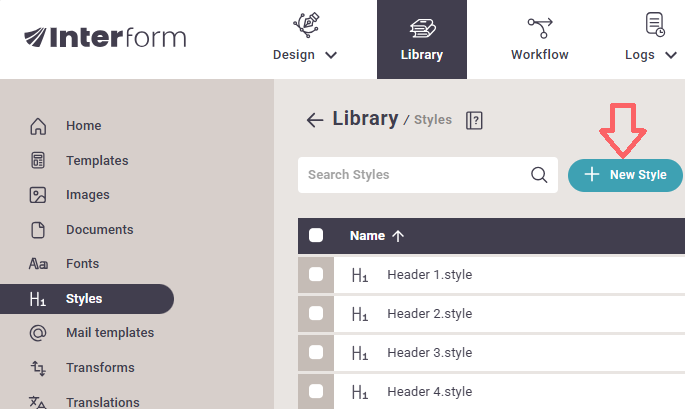 To create a new style you select the styles under Library and here click the + New style icon on the top:
